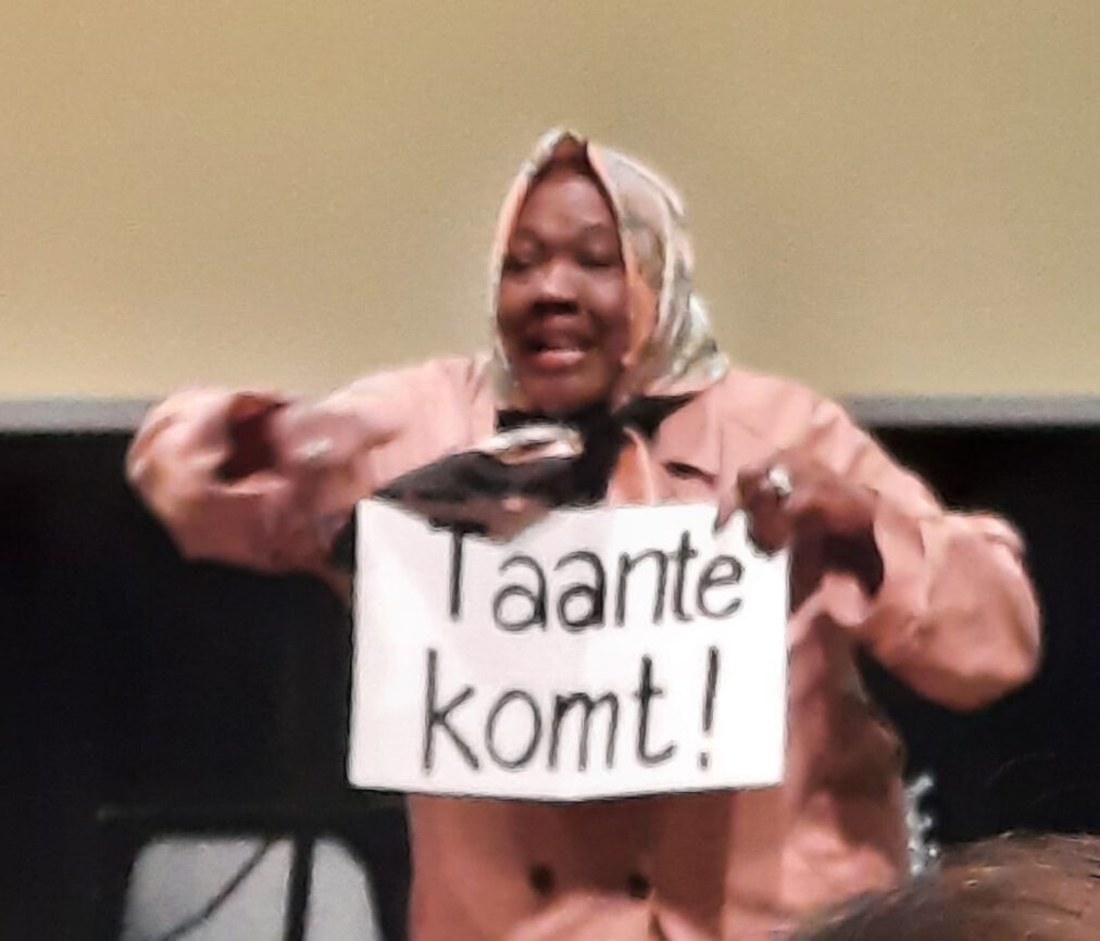 Witte mensen hebben veel papier nodig. En ze trok een heleboel vellen papier tevoorschijn. De overheid wil praten over mensen die ouder worden. De overheid moet geholpen worden. Praten en het verstaan is een heel verschil. Ze deed een sjerp om waarop stond “Miss Communicatie”. Ze noemt zichzelf vrijwilligster in de bemoeizorg. Dit moet je nooit op eigen titel doen. Je moet een STICHTING in het leven roepen. Liefst met een hele moeilijke naam Dan begrijpt de overheid het pas! En zo kwam er van alles langs. Heel leuk.
